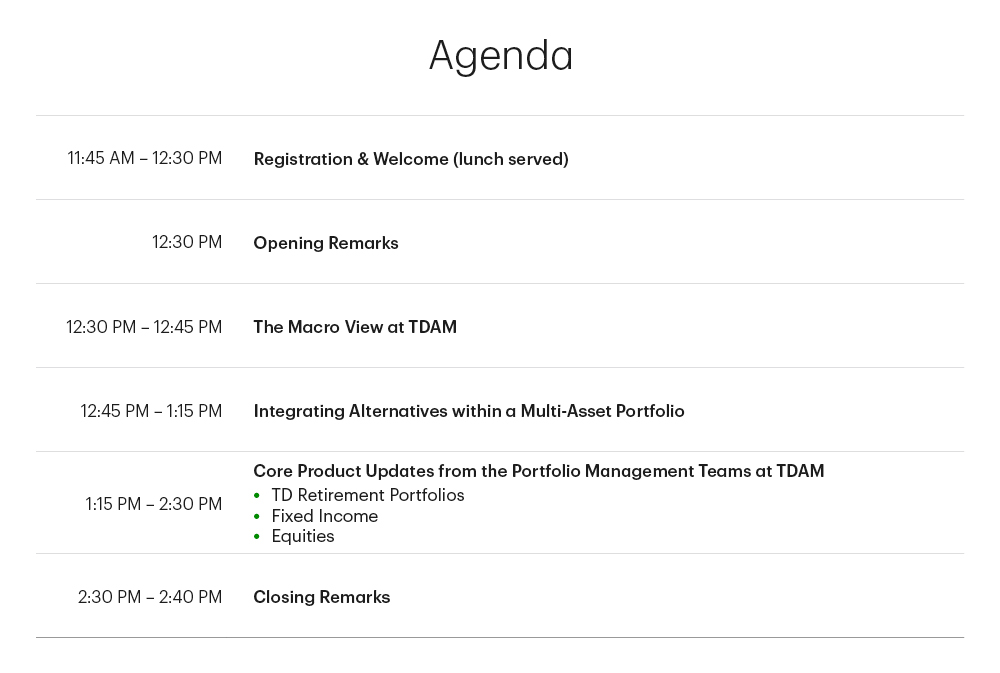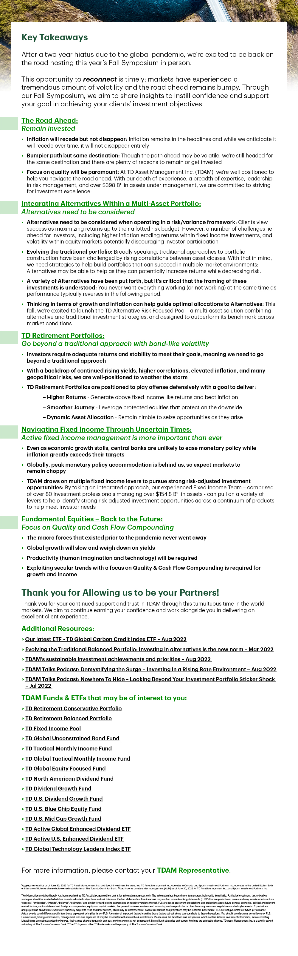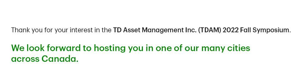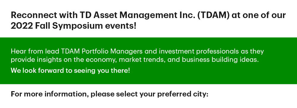Commissions, trailing commissions, management fees and expenses all may be associated with mutual fund investments. Please read the fund facts and prospectus, which contain detailed investment information, before investing. Mutual funds are not guaranteed or insured, their values change frequently and past performance may not be repeated. Mutual fund strategies and current holdings are subject to change. TD Asset Management Inc. is a wholly-owned subsidiary of The Toronto-Dominion Bank. ® The TD logo and other TD trademarks are the property of The Toronto-Dominion Bank.